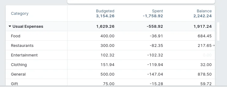 From the Budget screen, you can see I've spent every last dollar of my clothing category for the month.